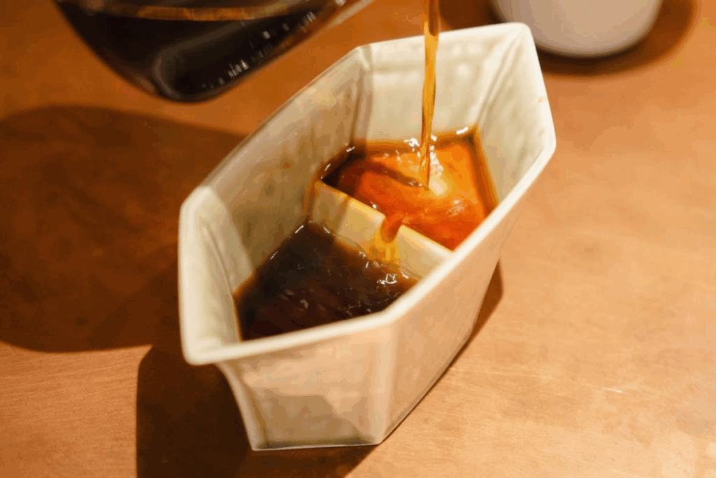 ドリップしたコーヒーを透明なビーカーで受けるのはカフェでよく見かける風景だが、この多面体の器はなんともユニーク。